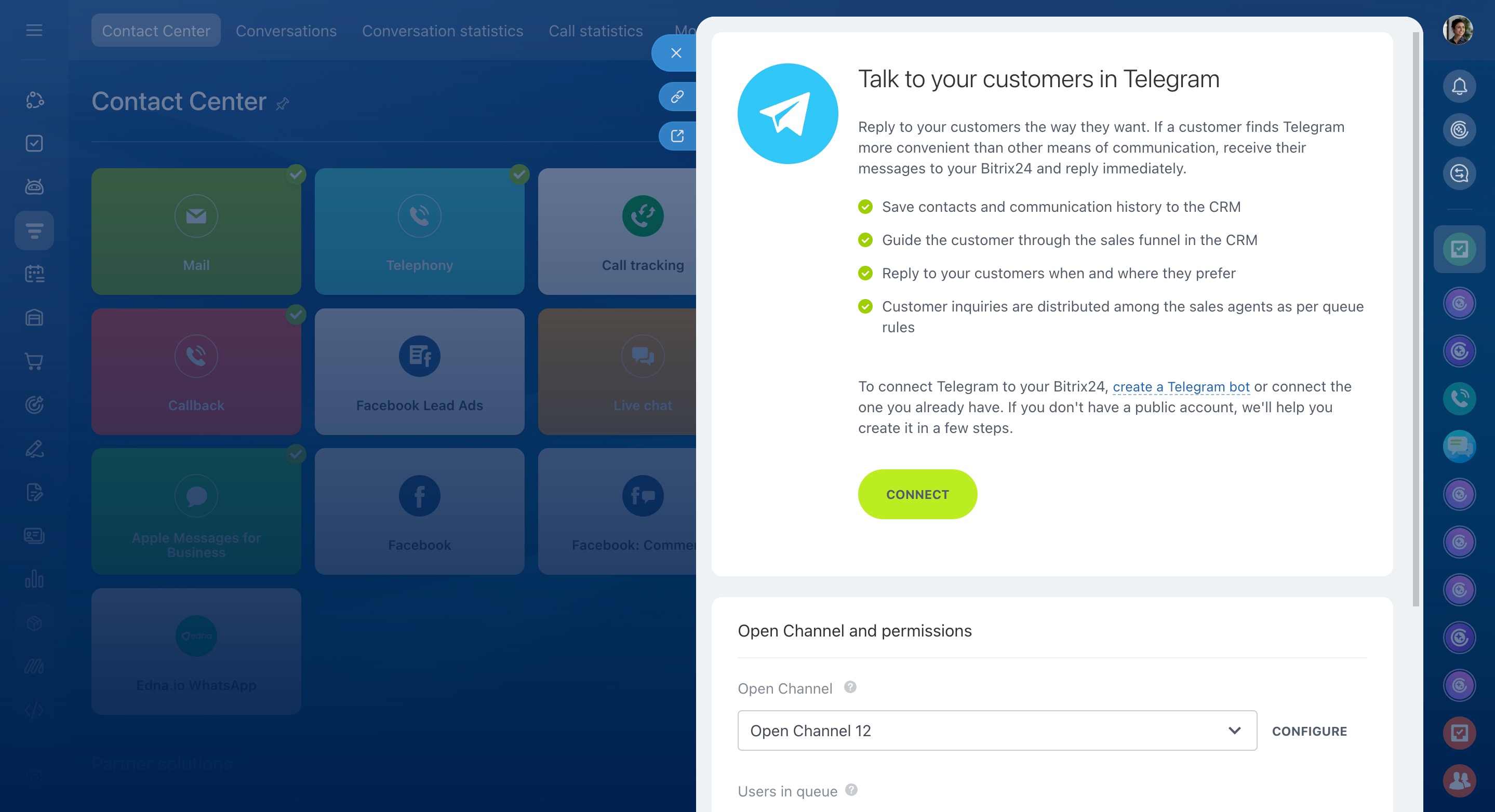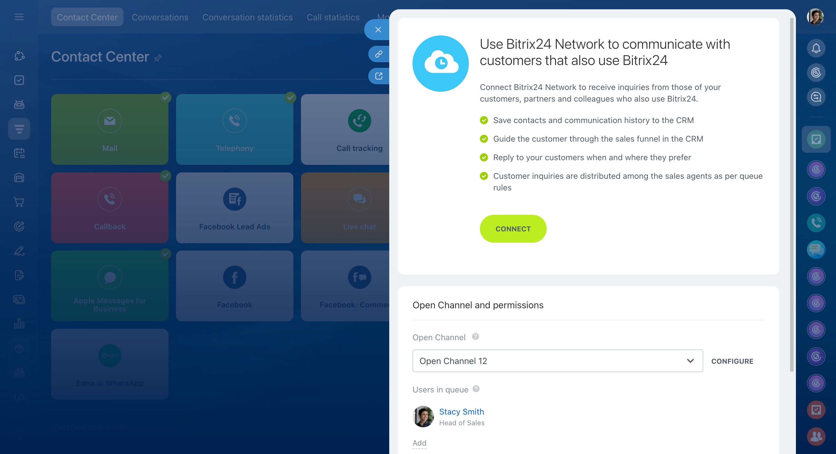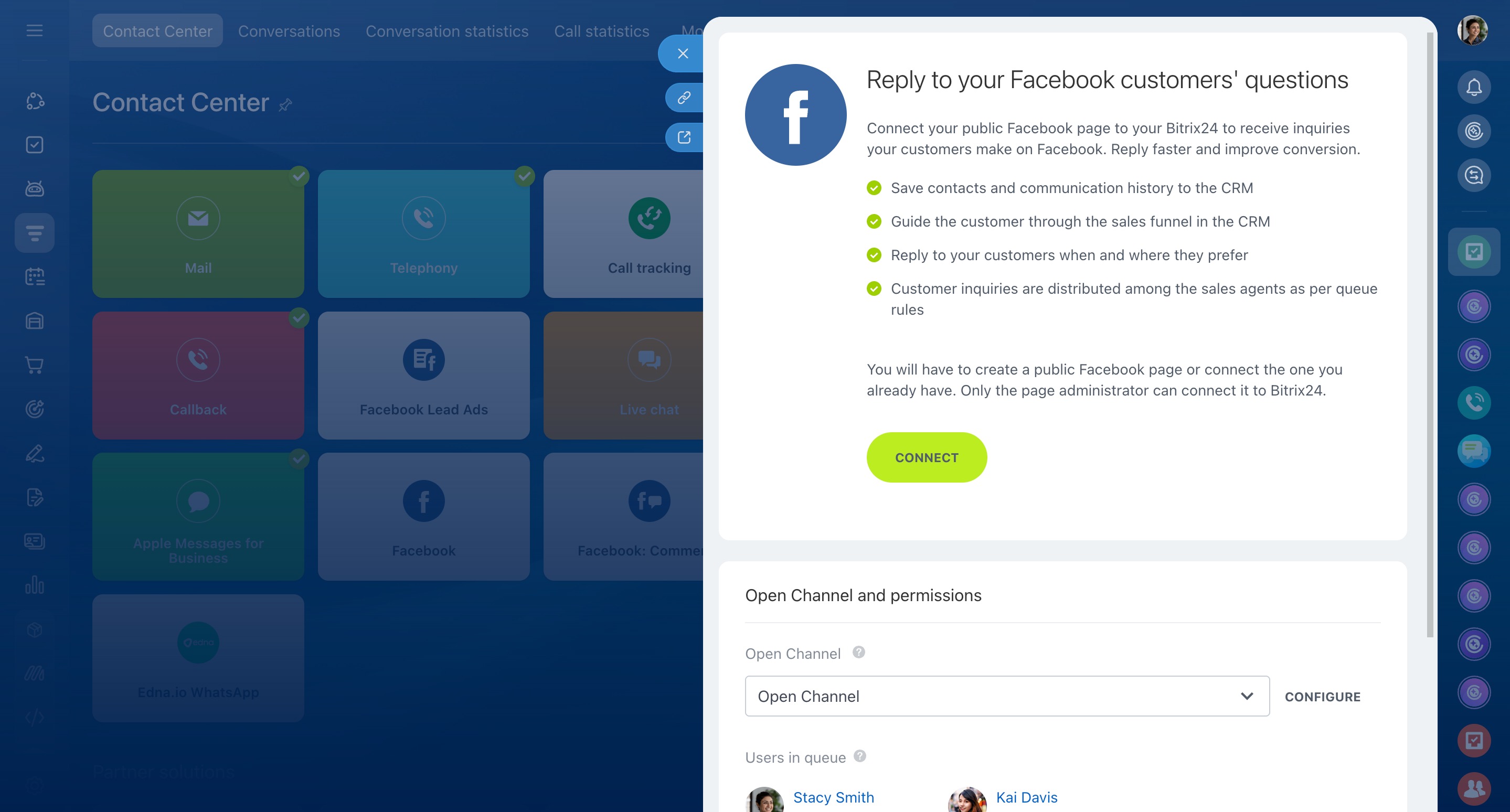 The Contact Center helps you manage customer conversations from messaging apps, social media, live chat, and other channels. All messages are received in Bitrix24 and saved in CRM.