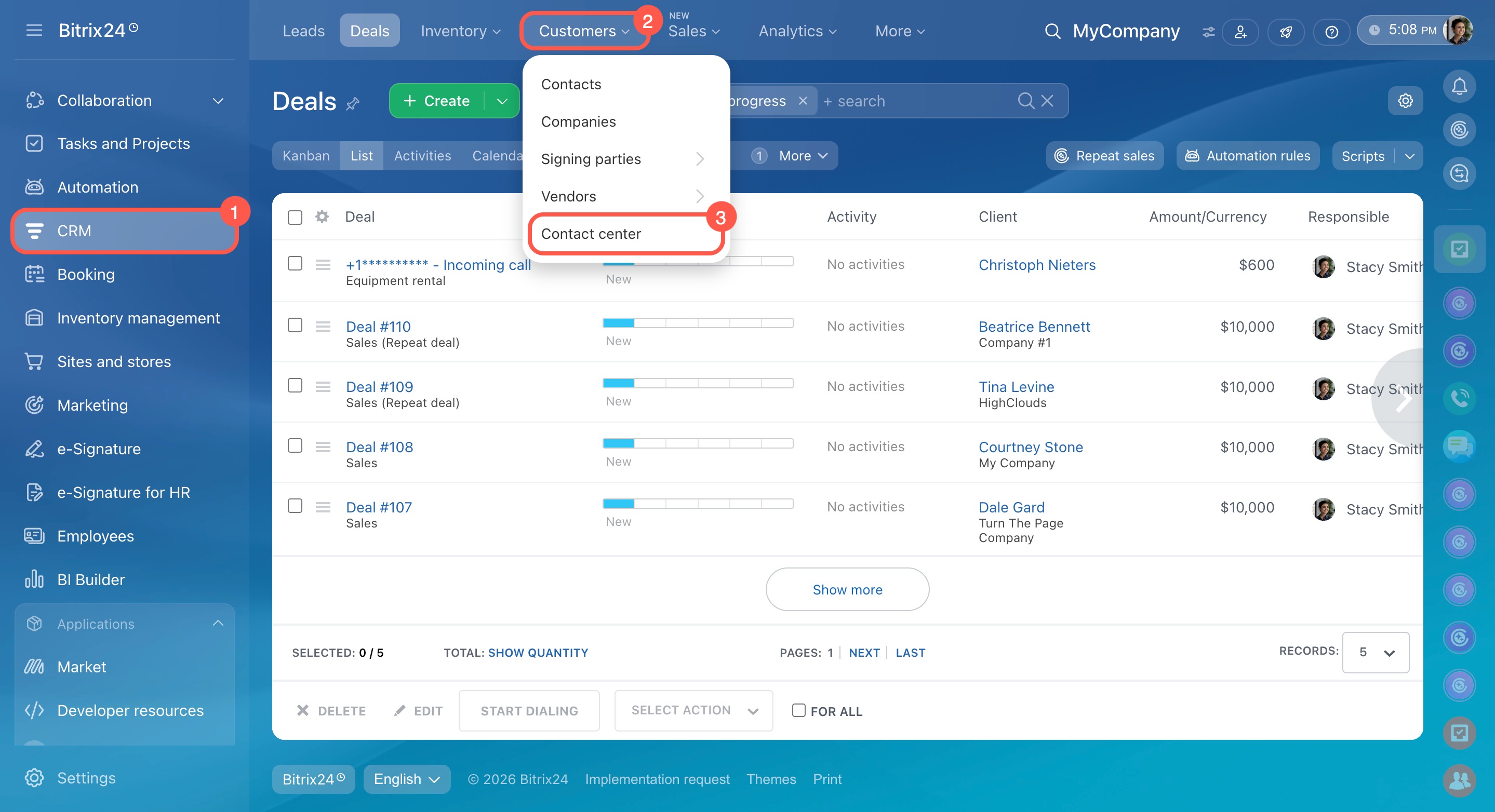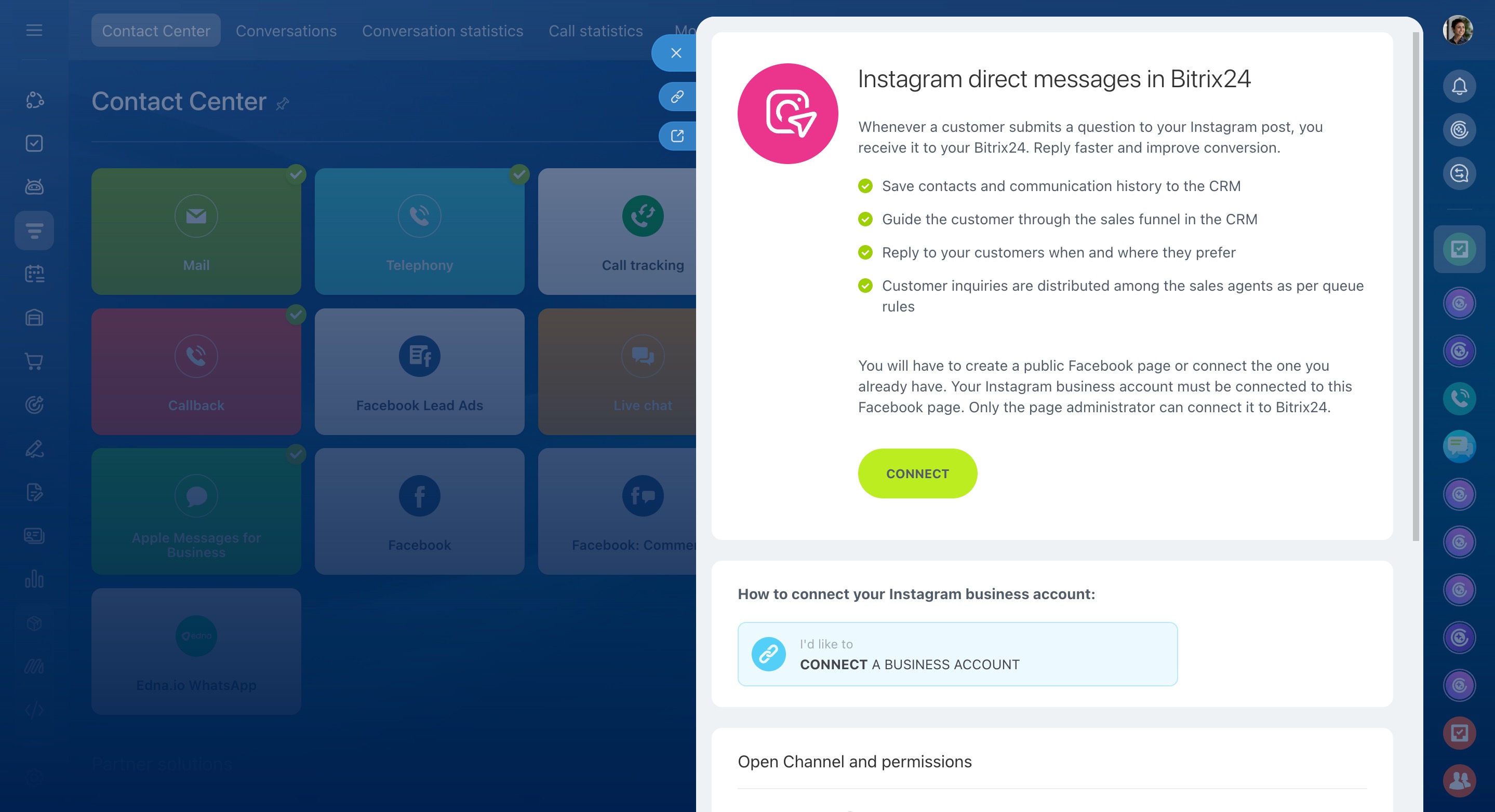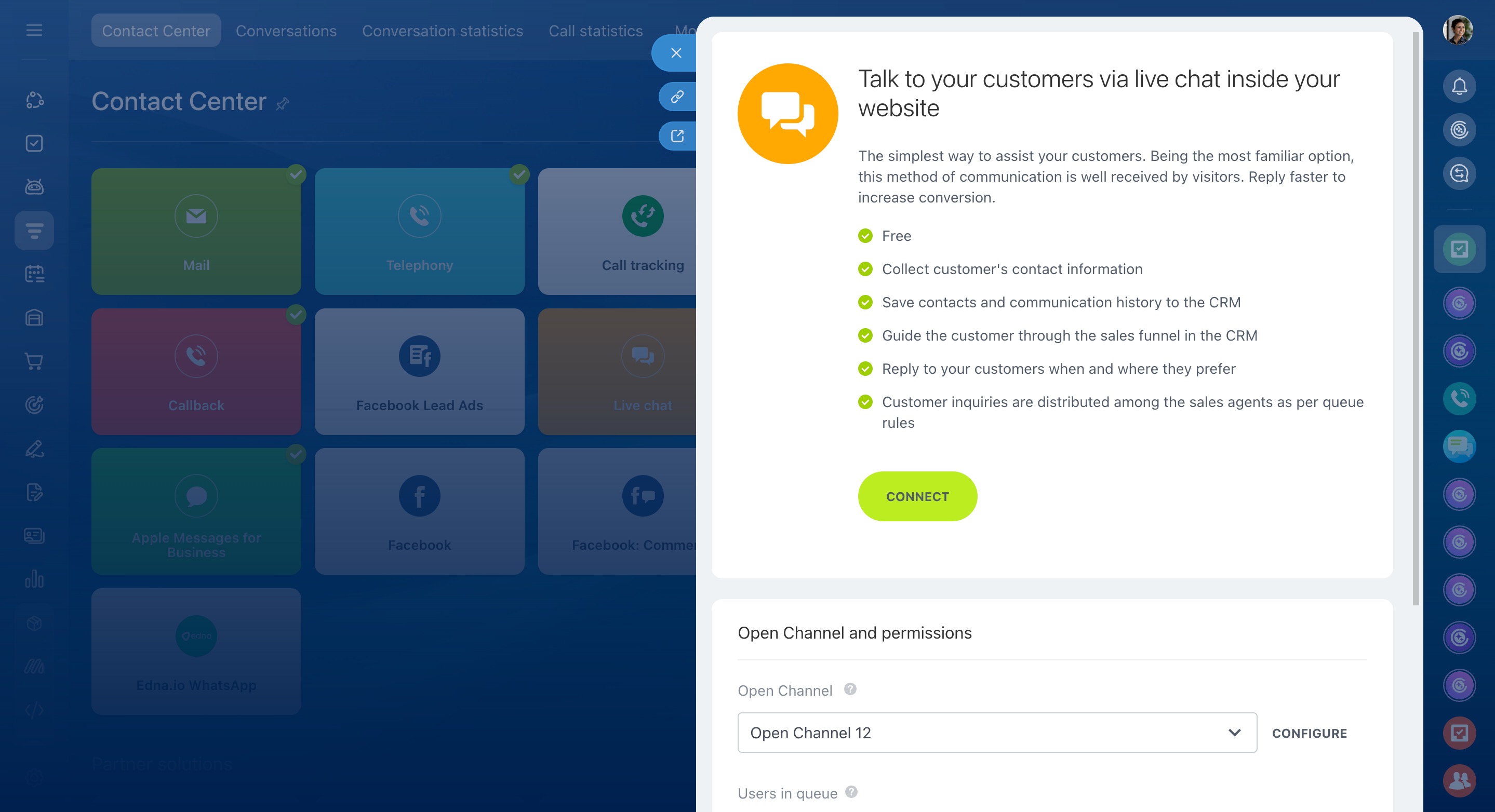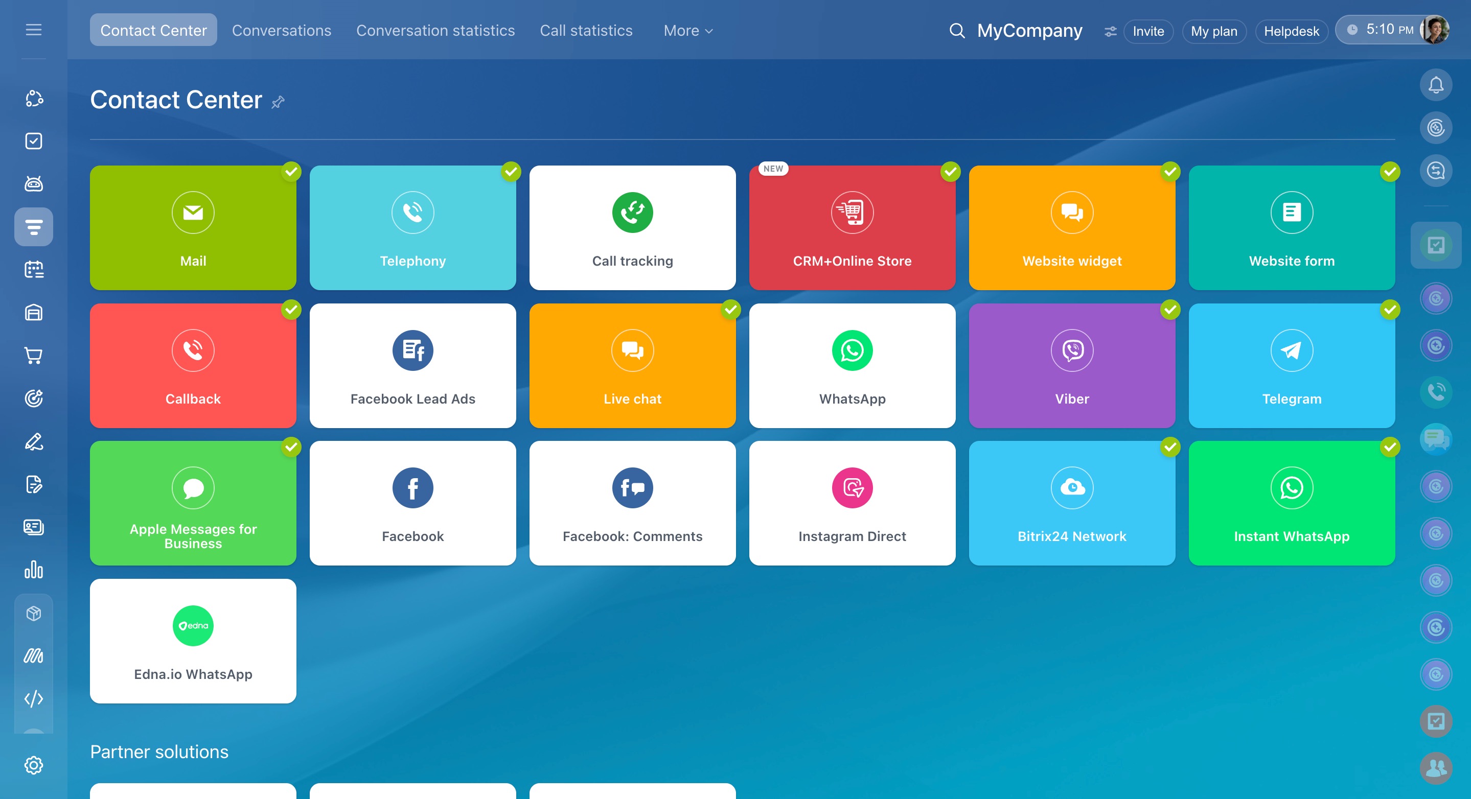 The Contact Center helps you manage customer conversations from messaging apps, social media, live chat, and other channels. All messages are received in Bitrix24 and saved in CRM.