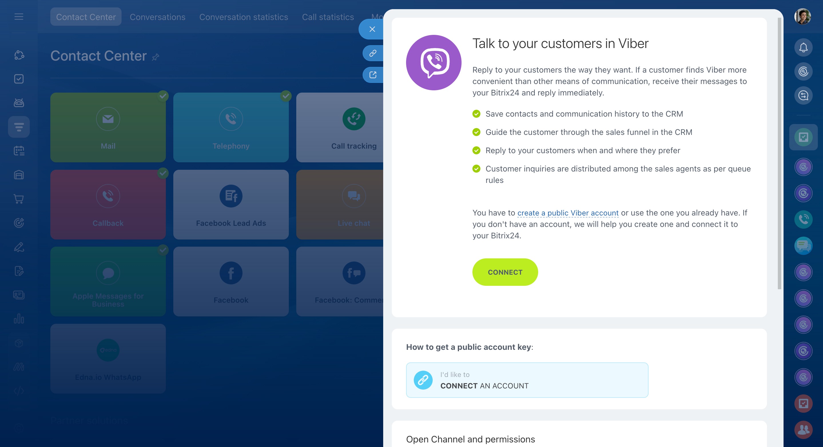 To connect Viber to Bitrix24, send a request to Viber directly. If Viber approves it, you will receive a key to enter in the Viber connection settings in Bitrix24.