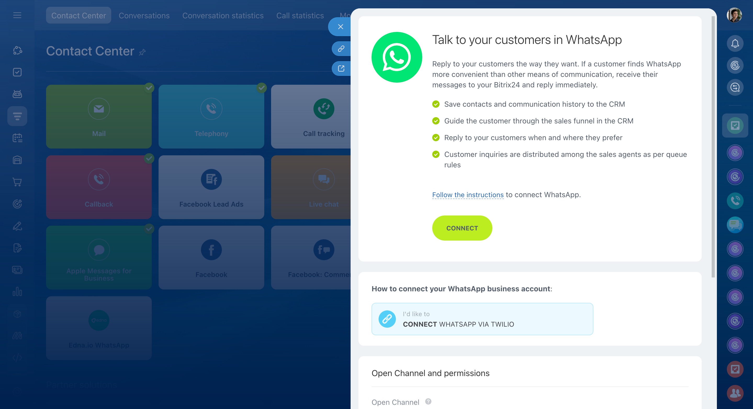 Connect WhatsApp via Twilio. Rent a dedicated number from Twilio and connect WhatsApp to Bitrix24 in a few steps.