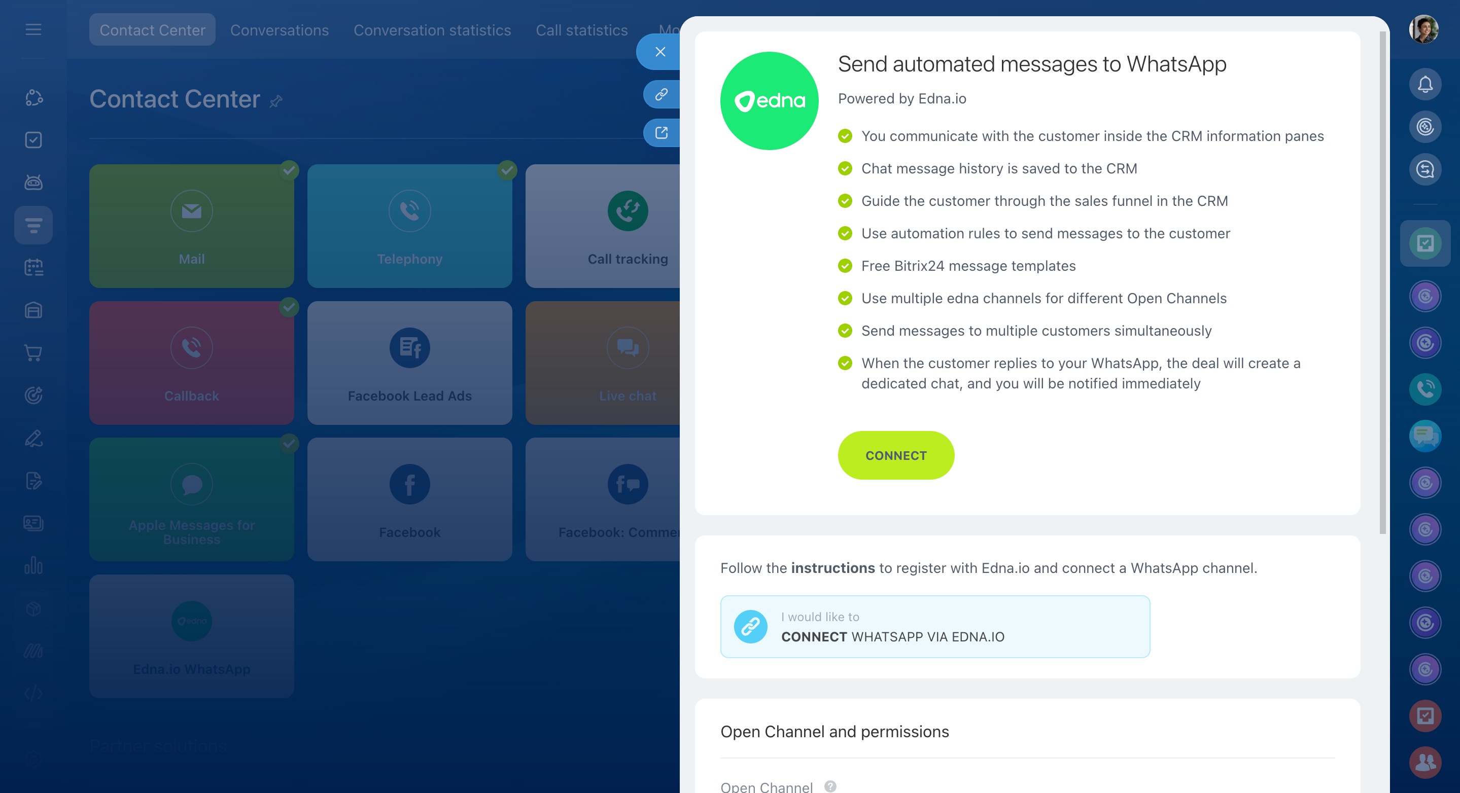To use template messages, connect the Edna.io WhatsApp channel in Bitrix24. Sign up for edna Pulse, create a Facebook Business Manager account, and set up the channel and message templates in the provider account.