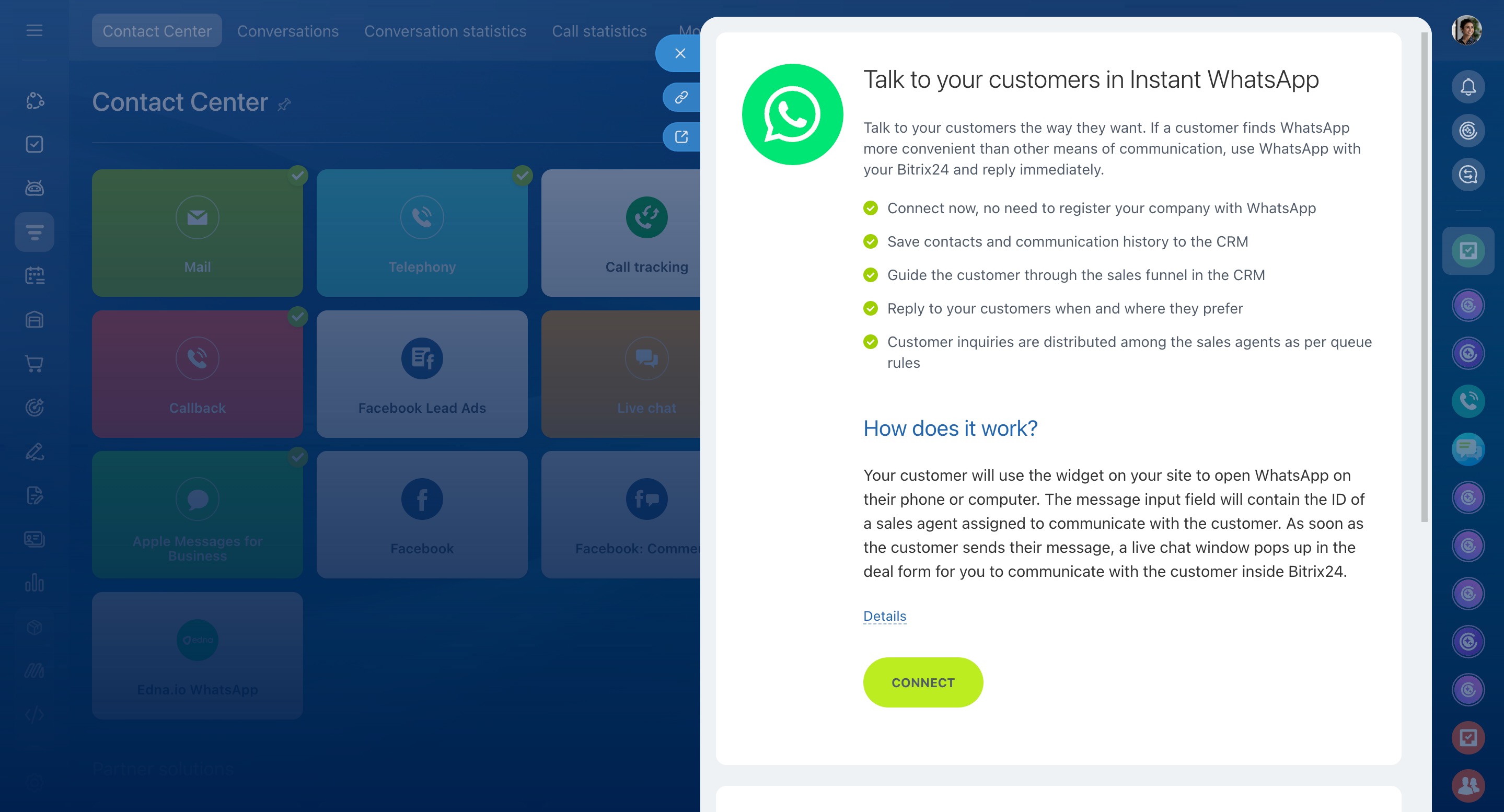 Connect Instant WhatsApp. This method lets you connect WhatsApp to Bitrix24 without registering your business with WhatsApp. You can add this channel to your website widget. When a customer visits your site and chooses WhatsApp, they can message you from a desktop or mobile device. The message then appears in Bitrix24.