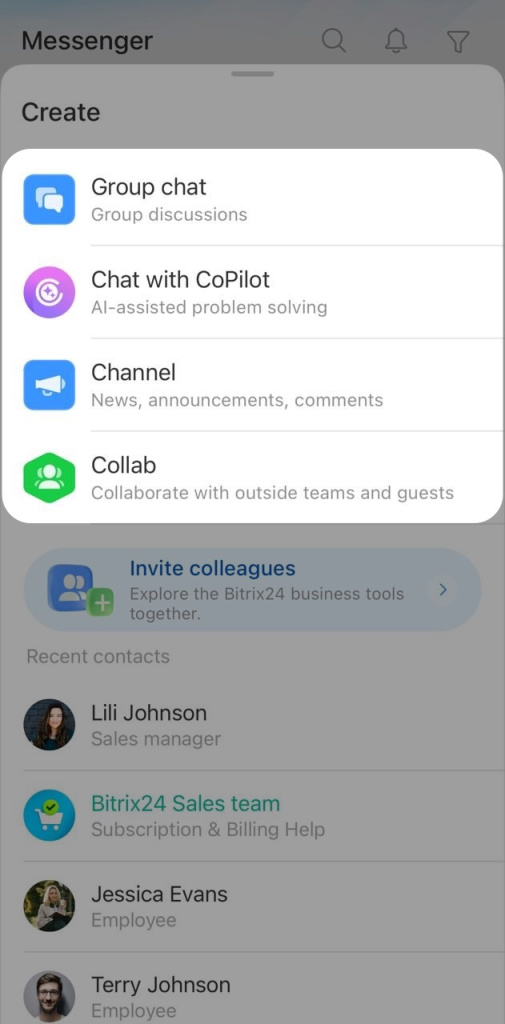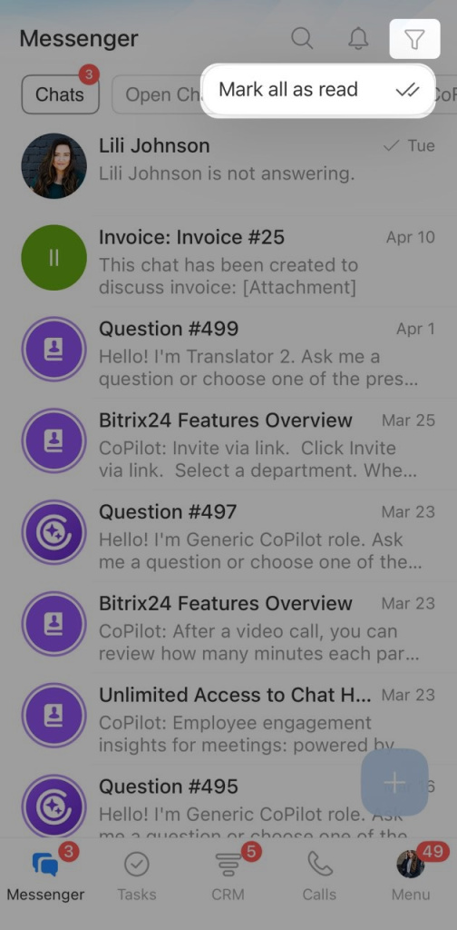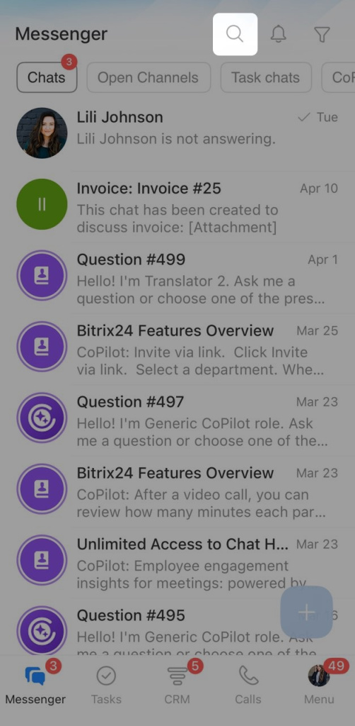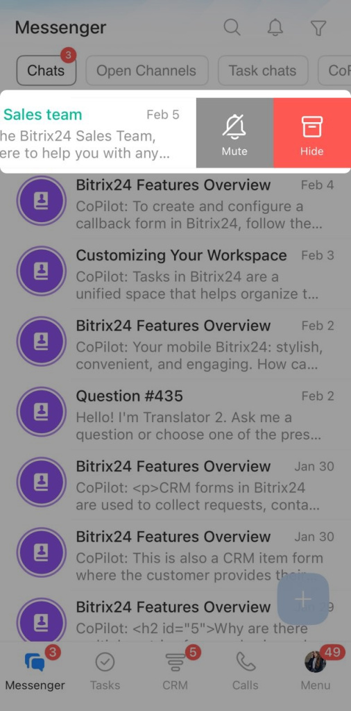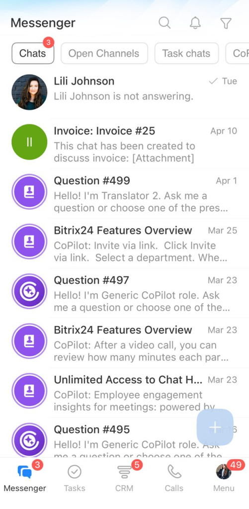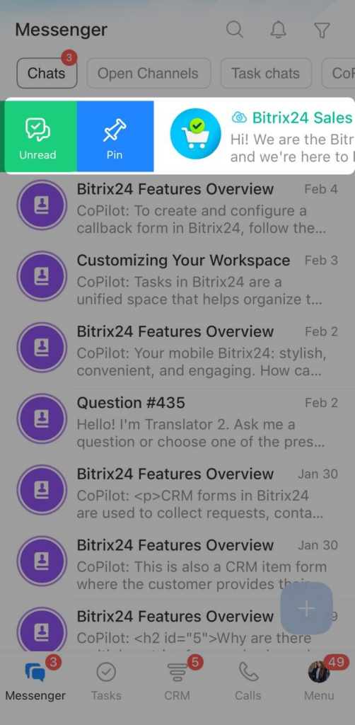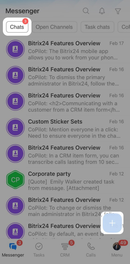 Bitrix24 Messenger brings your chats with coworkers, clients, and CoPilot into one place. From the chat list, you can open conversations, pin important chats, create new chats, and more.