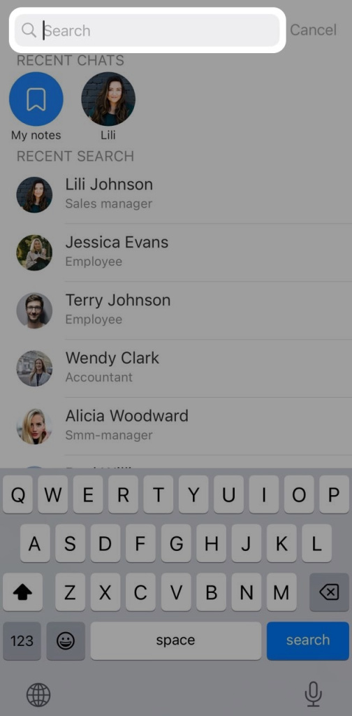 Enter an employee name or chat name in the search bar. For faster access, you can also use the recent chats list or your search history. Tap a chat to open it.