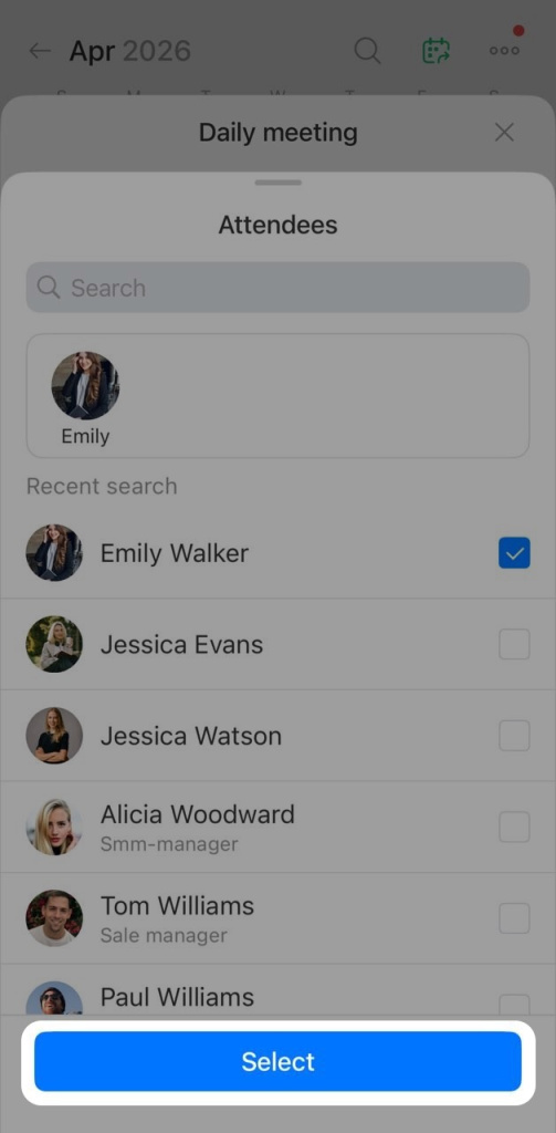 2. Find coworkers by name or choose them from the list, select the checkboxes next to their names. Tap Select.
