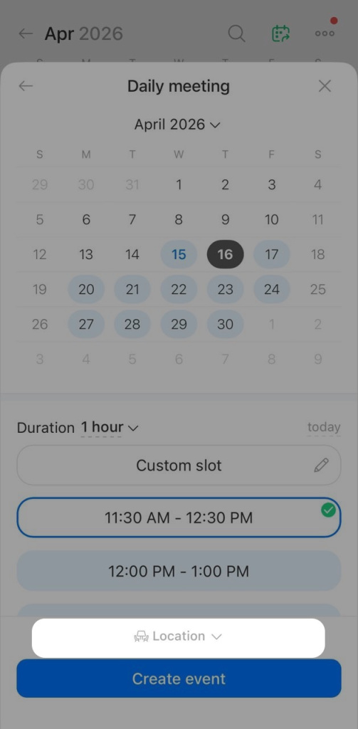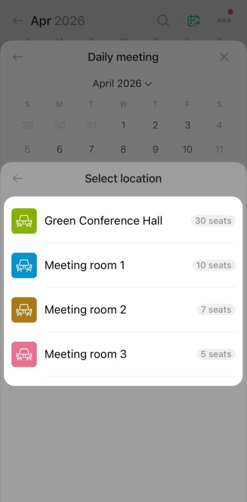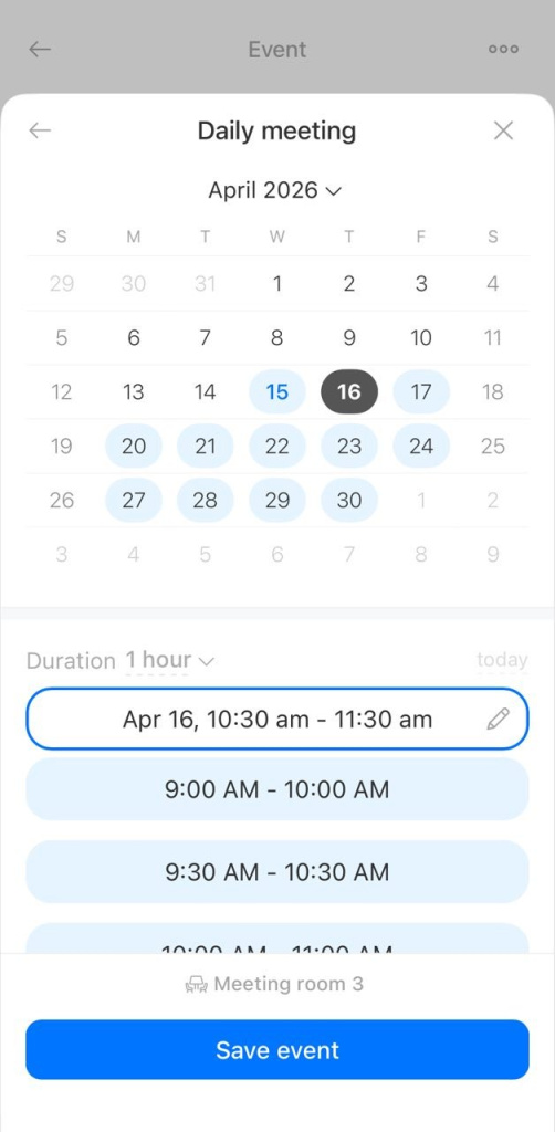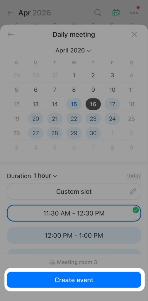 7. Tap Create event. The event will appear in the calendar with the meeting room listed.