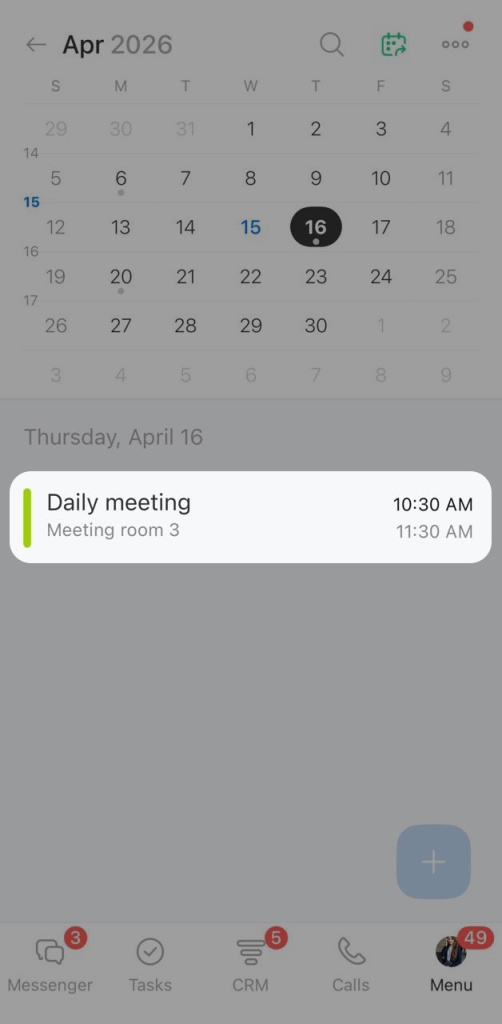 Bitrix24 Calendar helps you plan meetings and events. You can manage your own schedule and check when your coworkers are available.
