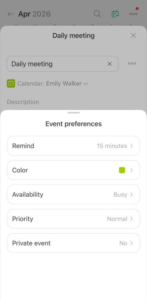 - Color — the color label for the event in the calendar.