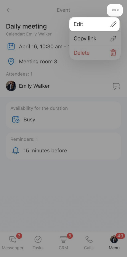 2. Tap Three dots (...) in the top-right corner of the event card and select Edit. You can also copy an event link here to share it.