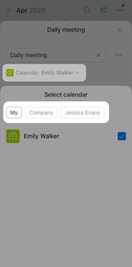 3. Tap the Calendar field to choose where to add the event — your personal calendar, the company calendar, or another employee's calendar. The company calendar and other employees' calendars are available only if you have the access permissions.
