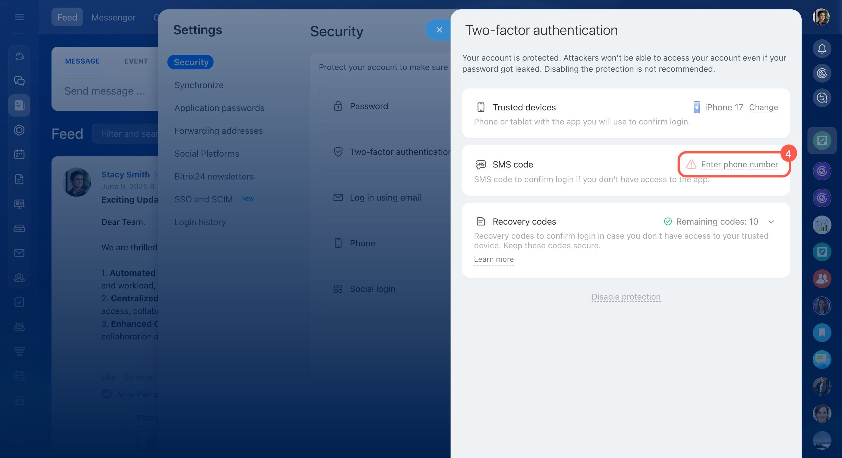 Two-factor authentication adds an extra layer of security to your Bitrix24 account. When you log in, you enter your password and verify your identity using one additional method: the Bitrix24 mobile app, SMS, or a recovery code.