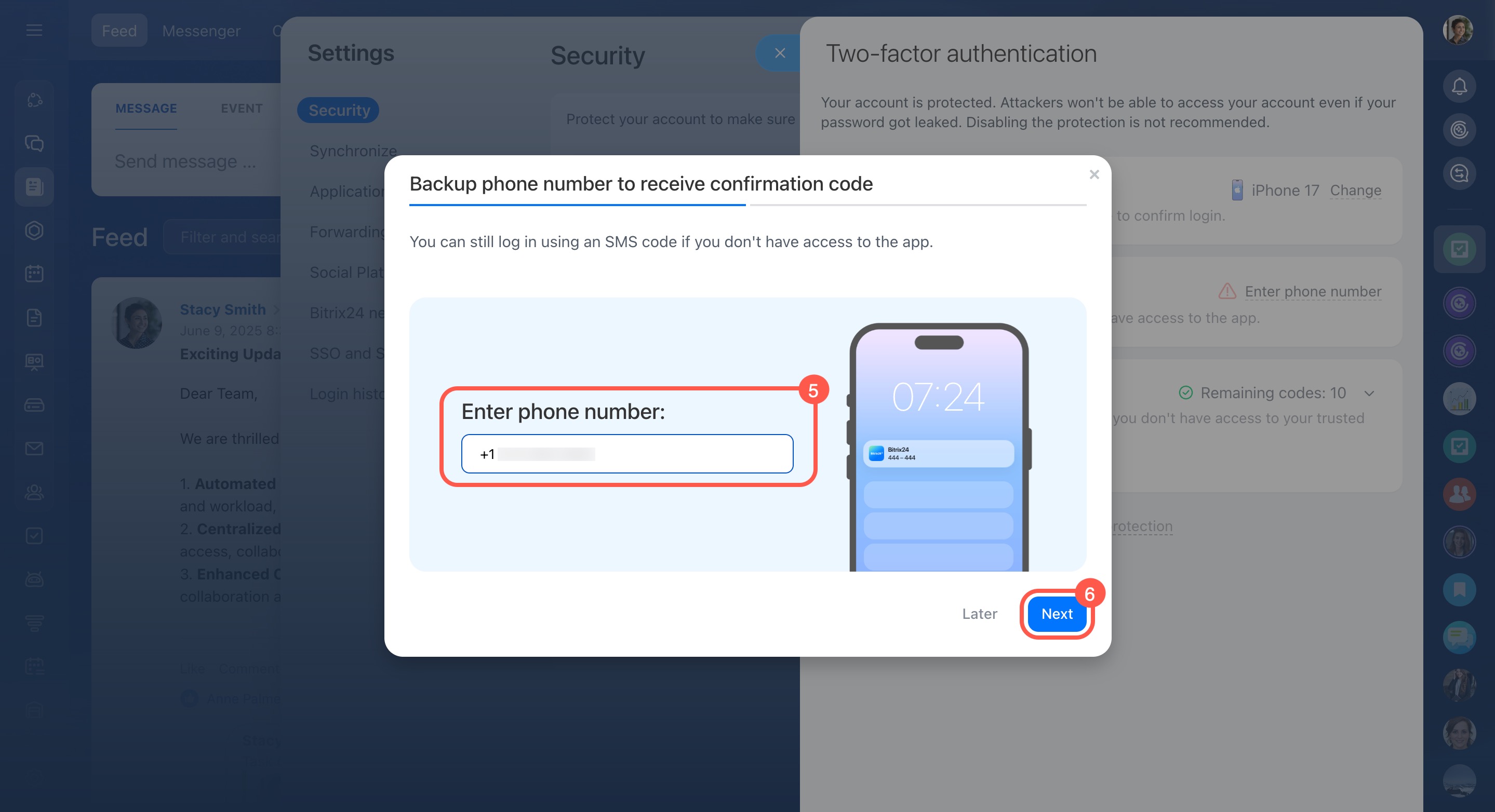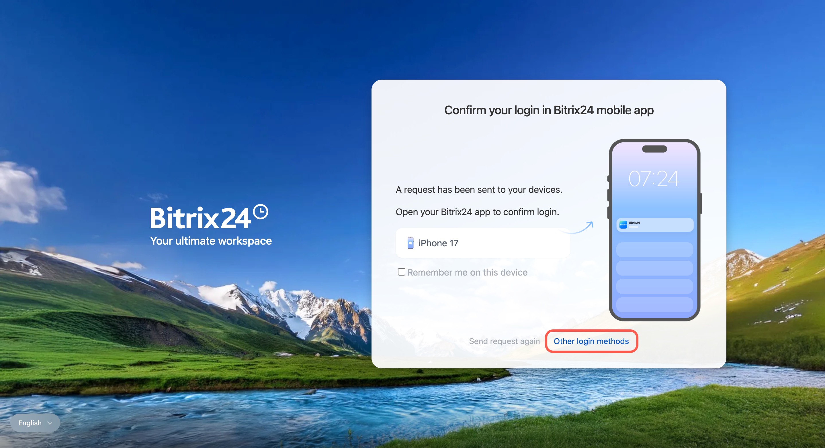 Log in to Bitrix24 using any available method: a push notification, SMS, or a verification code.