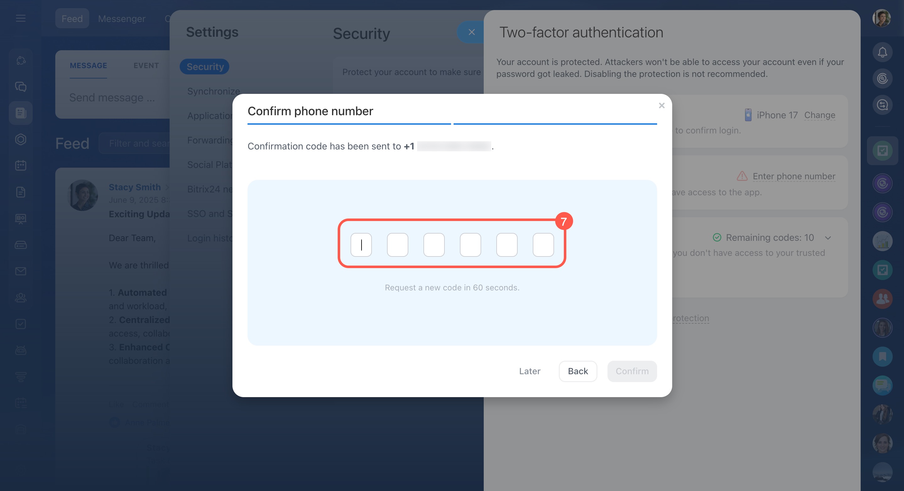 - Enter the code from the SMS sent to your phone. If the code is correct, Bitrix24 links the number automatically.