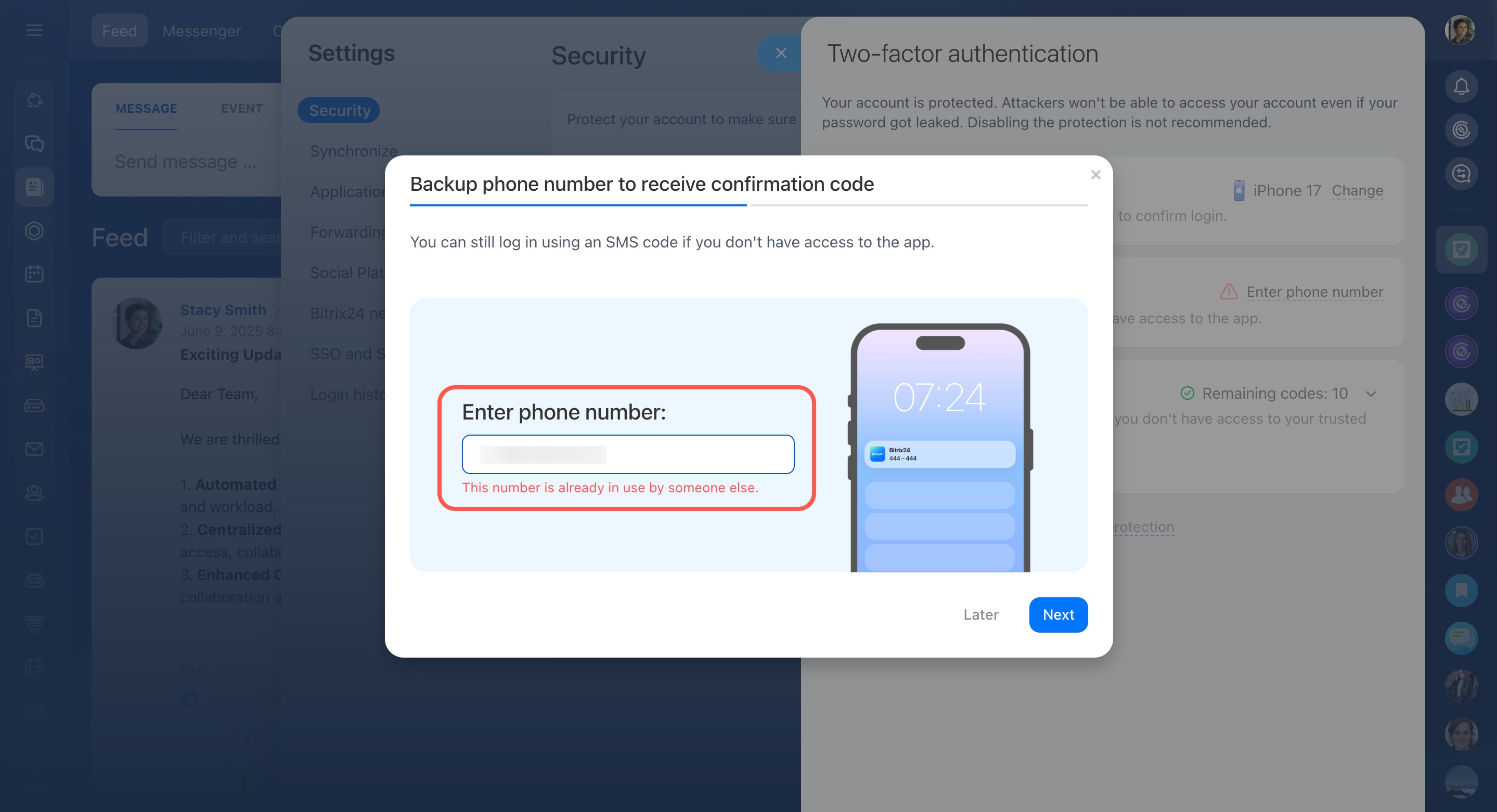 If the phone number is already in use, for example if it was assigned to a former employee, ask your Bitrix24 administrator to remove it. Then try again.