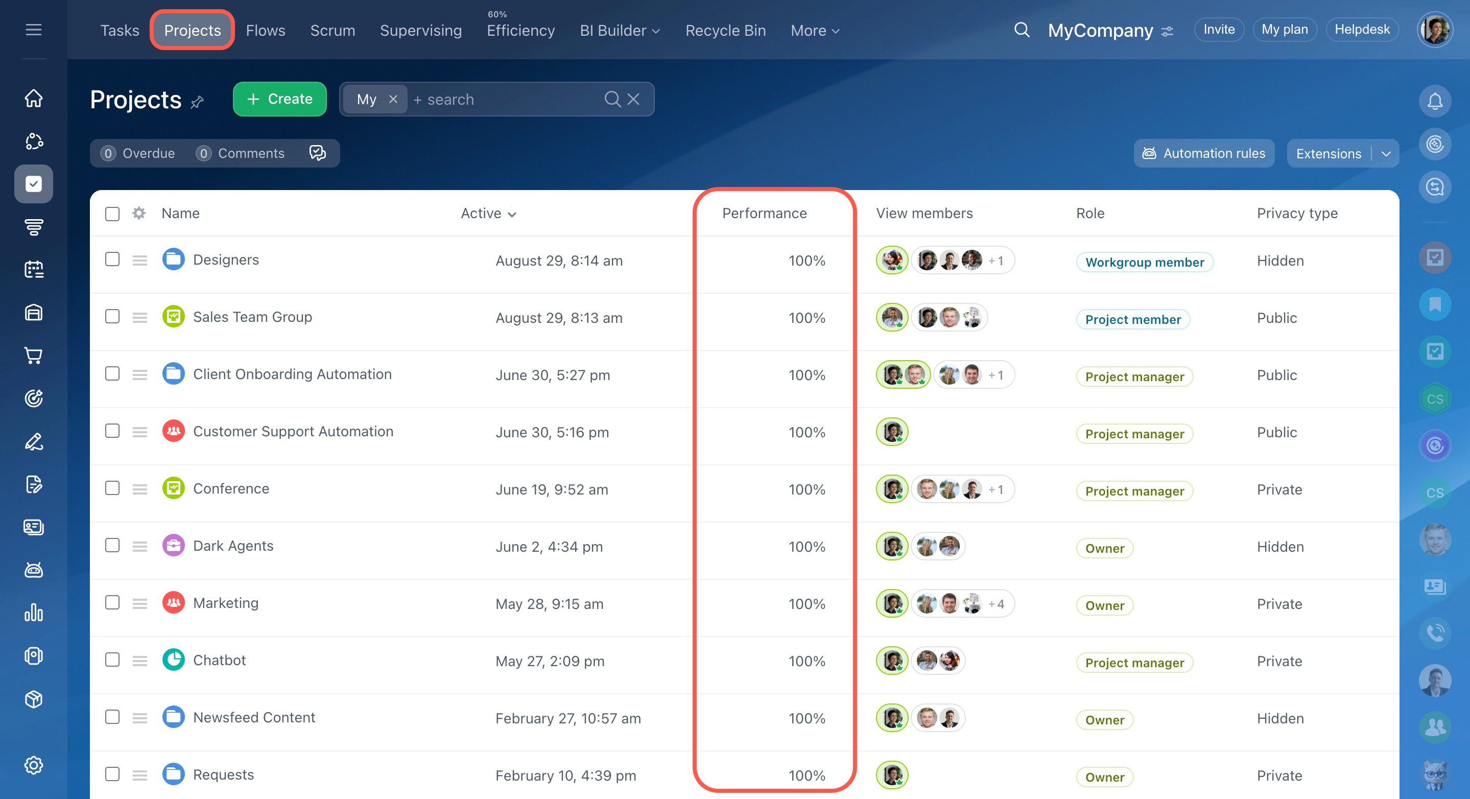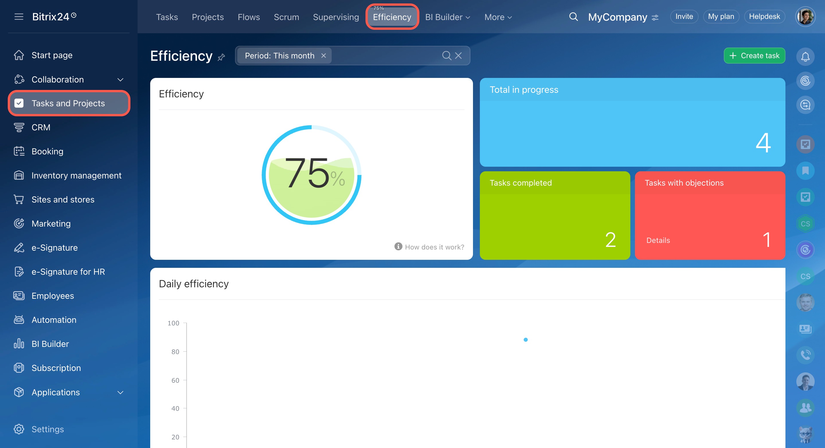 Go to the Tasks and Projects section and open the Efficiency tab.