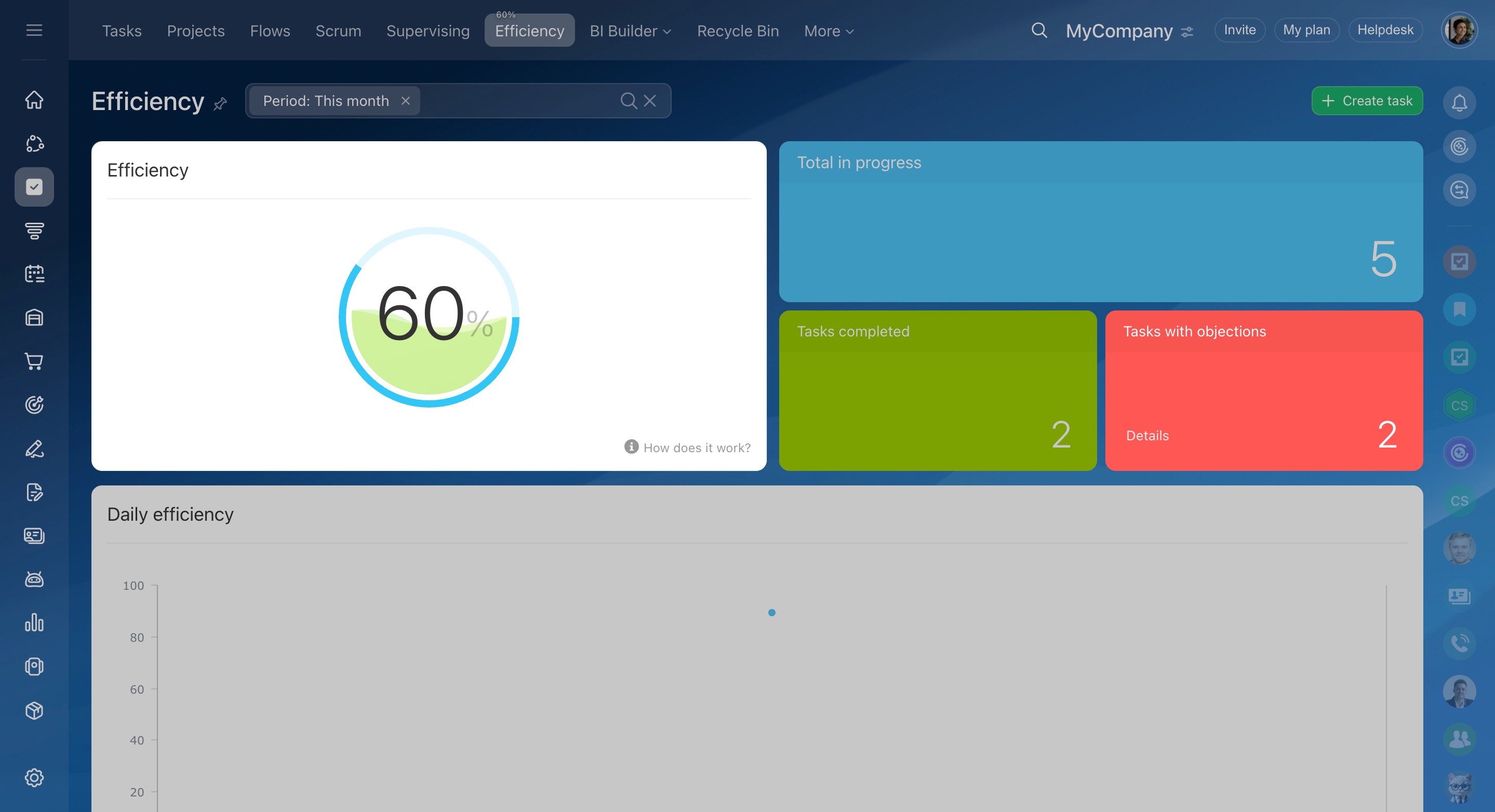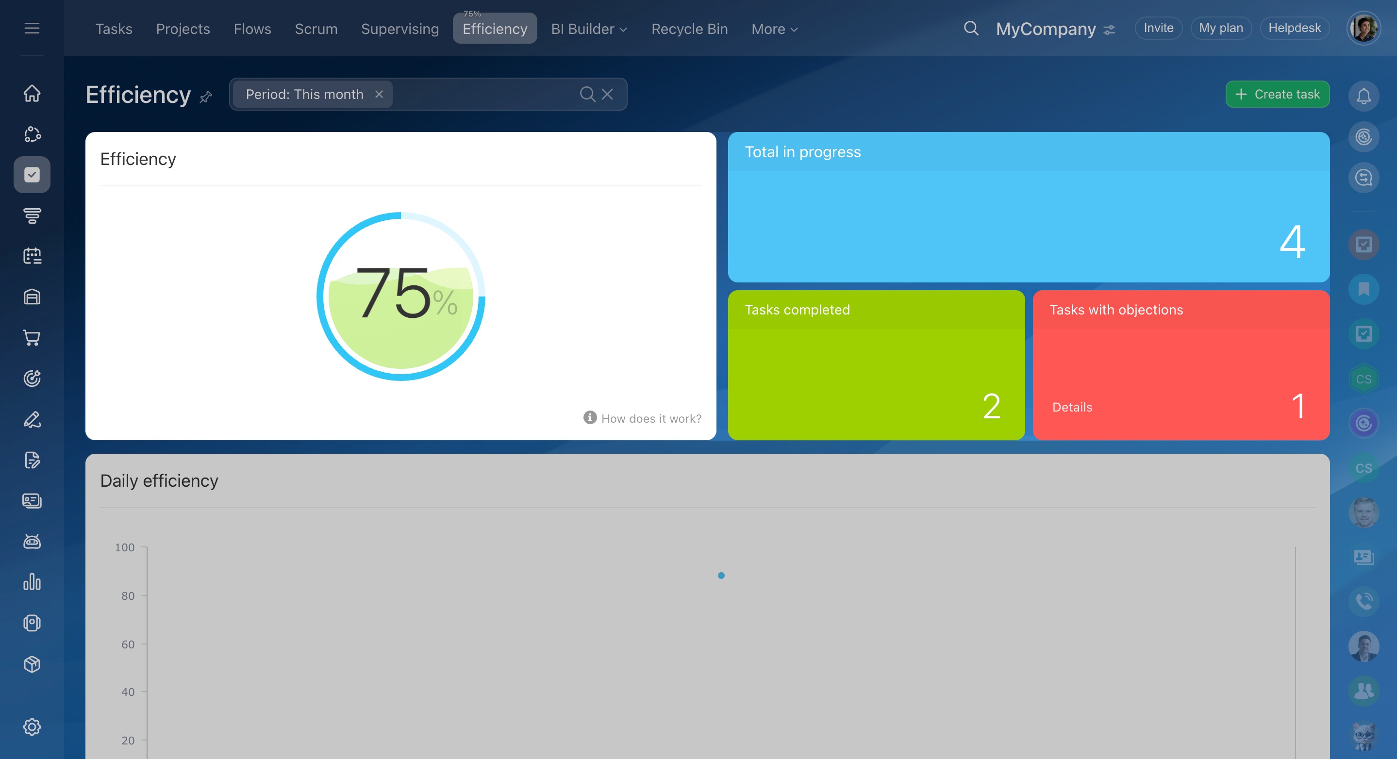If an employee sets a task for himself/herself, it will not be taken into account in the efficiency percentages. Therefore, it is impossible to artificially create an impression of high efficiency.