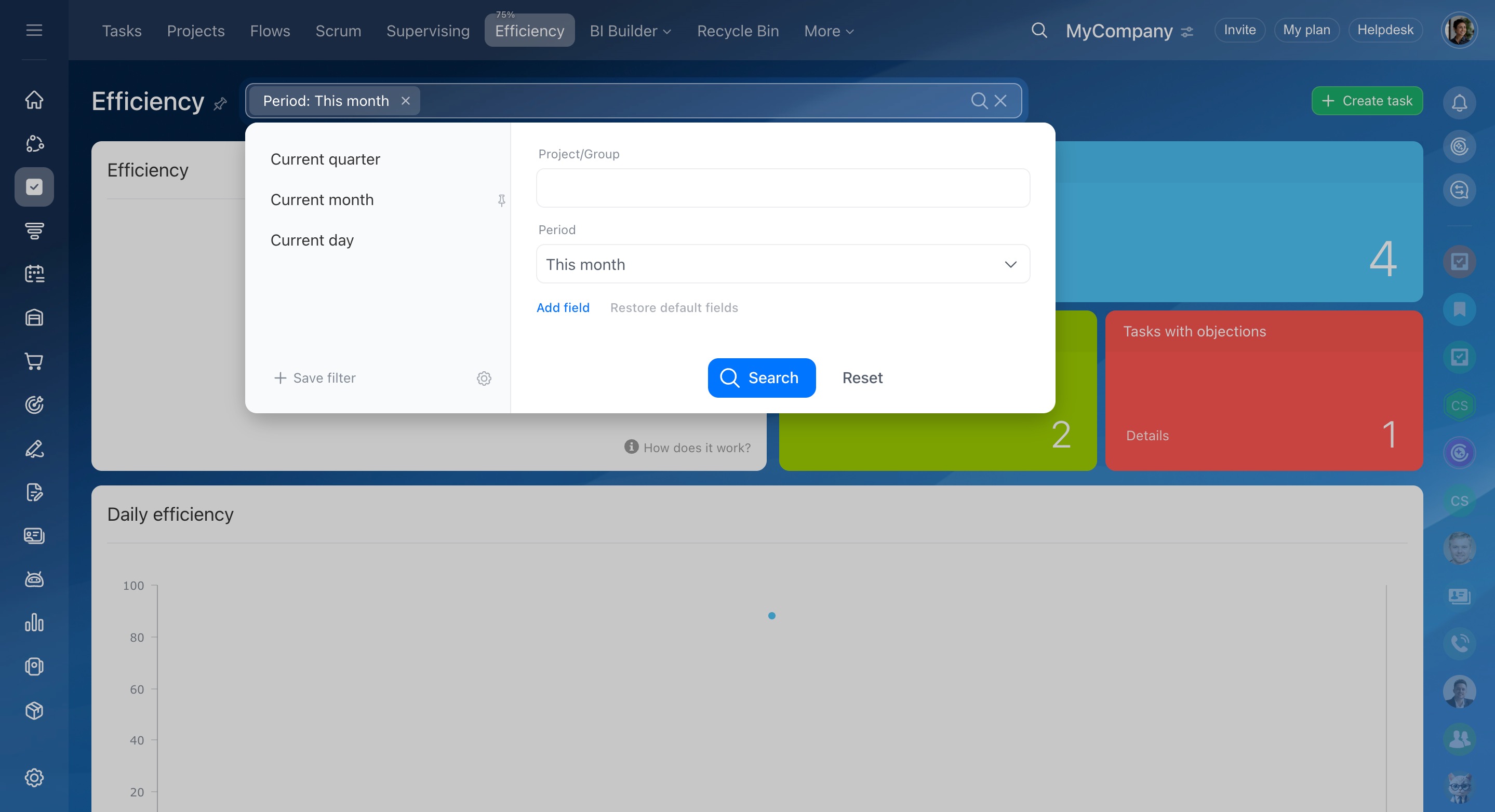In the filter, you can specify for which period to calculate the efficiency.