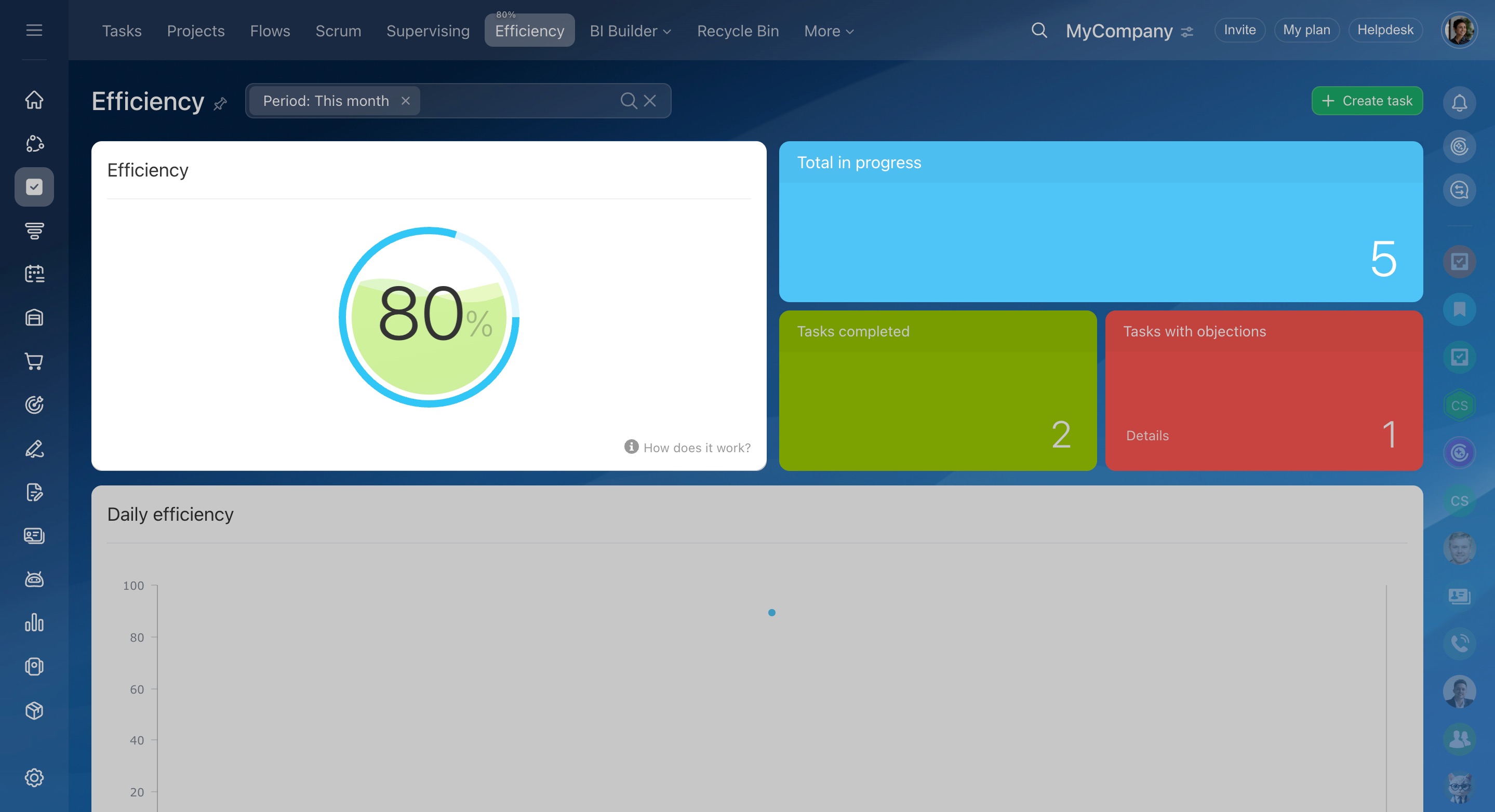 For example, an employee completed ten tasks during the month. Two of them were overdue. Let's calculate the efficiency: