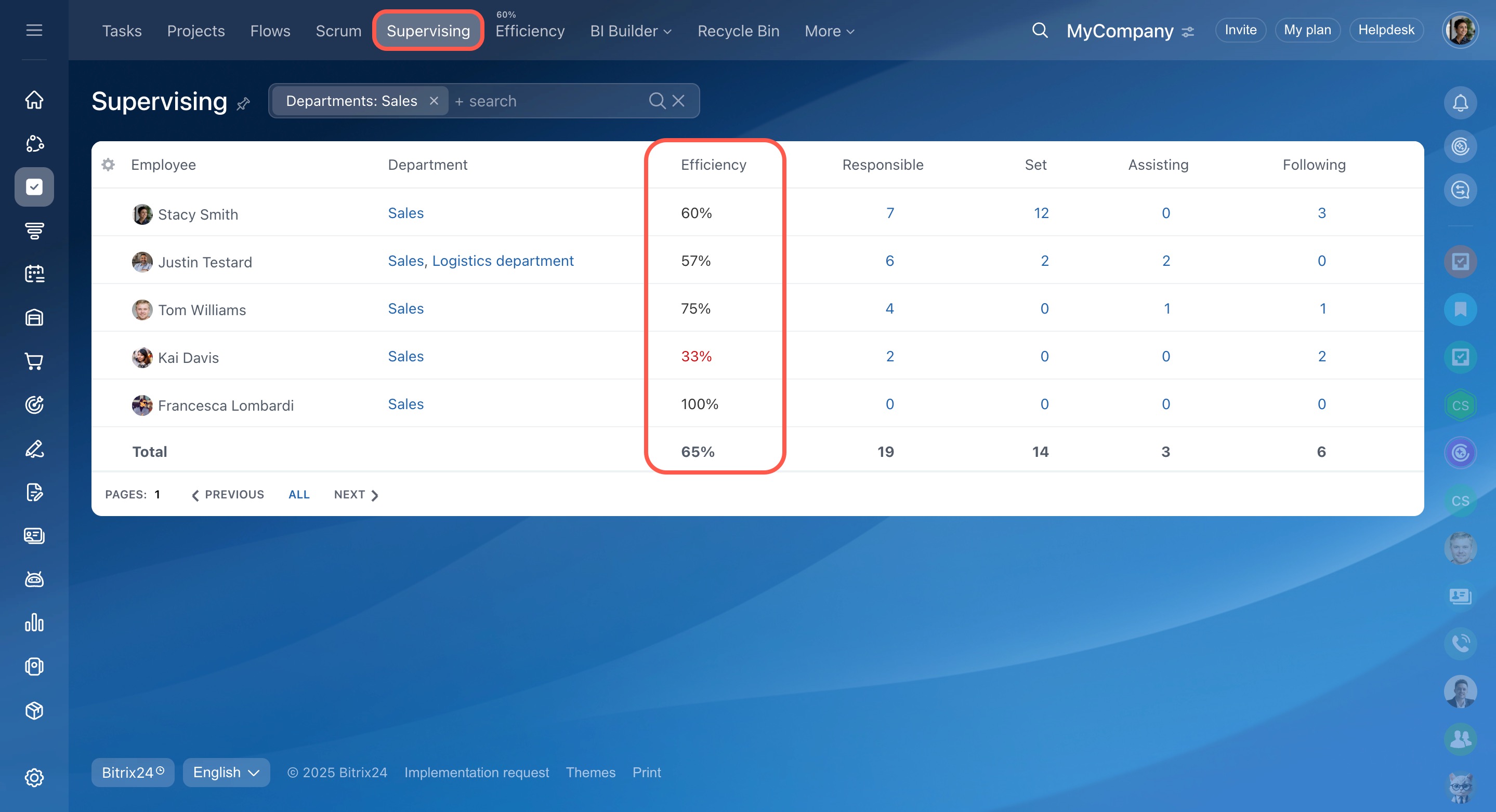 A supervisor can see the efficiency of the subordinates in the Supervising tab.