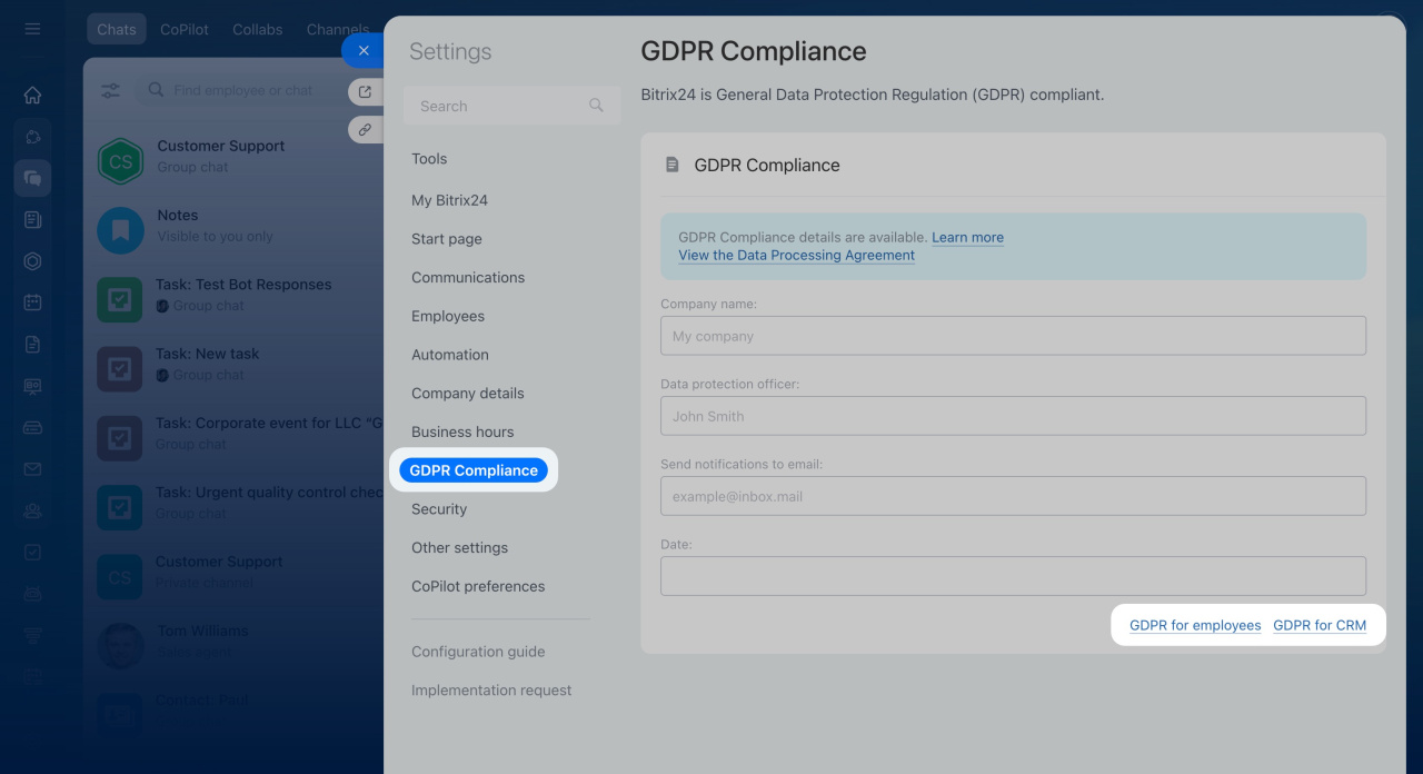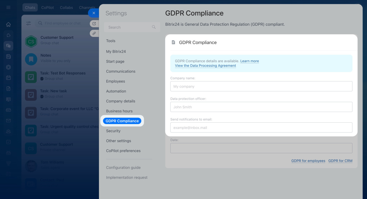 As Bitrix24 has many clients in the European Union, we follow GDPR compliance rules and maintain GDRP section on our website. Your Data Processing Agreement is accepted by you as a part of our main terms of service.